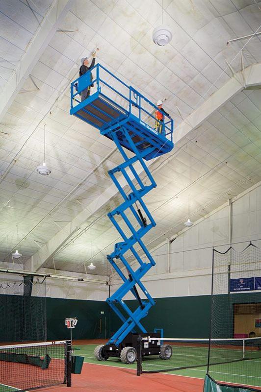 Offering quiet, zero-emissions operation, the all-electric Genie® GS™-2669 DC rough terrain scissor lift is excellent for both indoor and outdoor use. Thanks to its reduced dimensions, it is ideal for indoor work in confined spaces. Additionally, its rough terrain capabilities make it well-suited to construction, maintenance and installation applications on challenging ground, sand and mud.